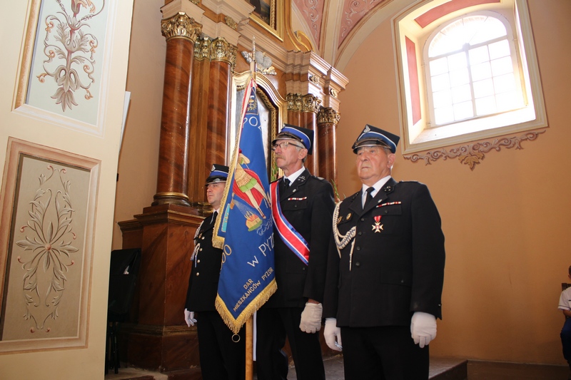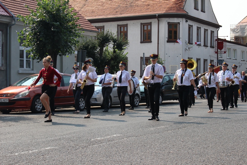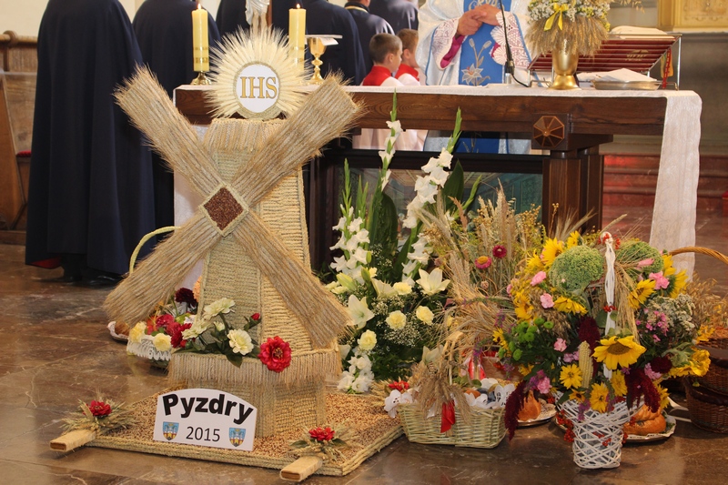 Mszę Św. poprzedził barwny korowód dożynkowy, który prowadzony przez Pyzdrską Orkietrę Dętą przemaszerował wokół rynku, a następnie wprowadził wszystkich do Kościoła Farnego. Jak nakazuje tradycja parafianie do świątyni przynieśli wiązanki ziół i kwiatów a delegacje ofiarowały wieńce dożynkowe, chleb, miód i kosze pełne warzyw i owoców. Złożone i poświęcone przez Proboszcza dary były, jak podkreślał w homilii ,,Owocem ciężkiej pracy, chlebem, który za pomocą rąk kapłańskich podczas przeistoczenia staje się ciałem Chrystusa''.