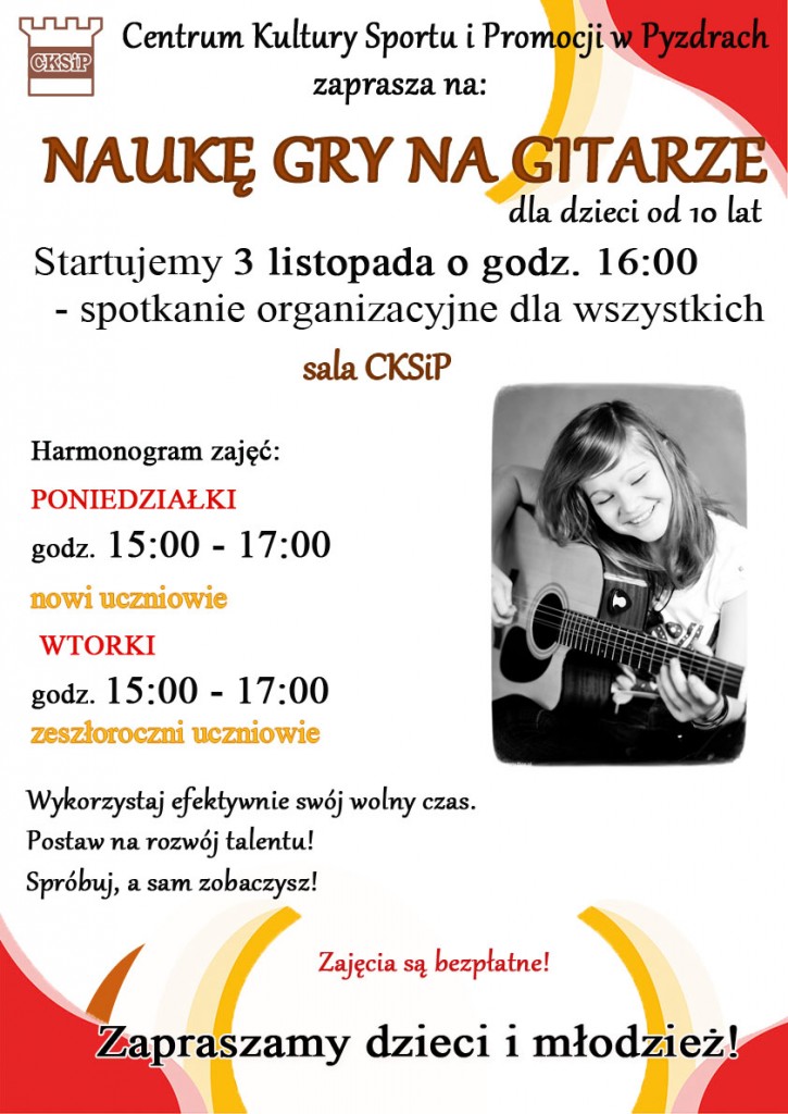 Od listopada do oferty jesiennych zajęć CKSiP wracają lekcje gry na gitarze. Zapraszamy chętne dzieci i młodzież na spotkanie organizacyjne, które będzie miało miejsce 3 listopada o godz. 16:00 w sali CKSiP.
