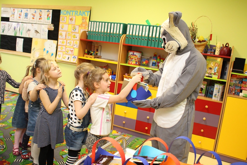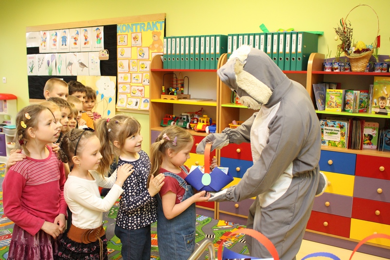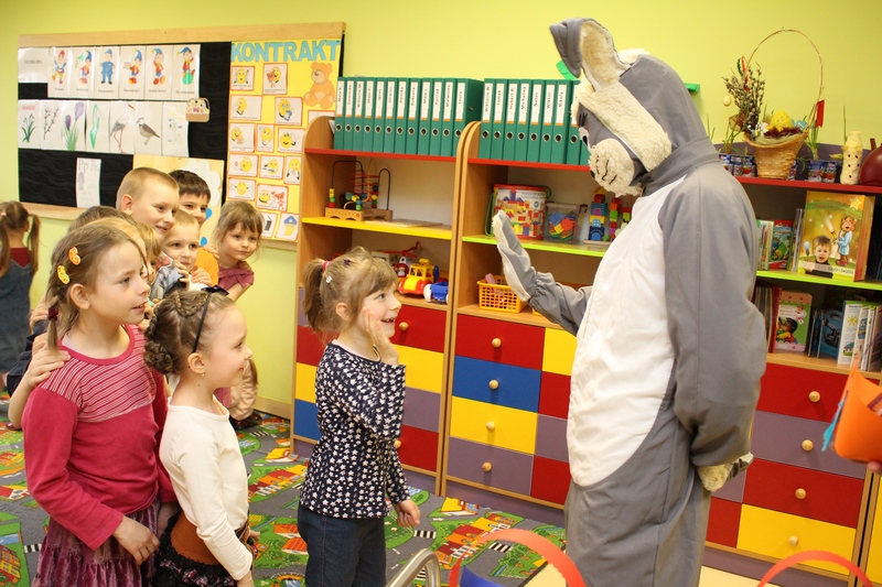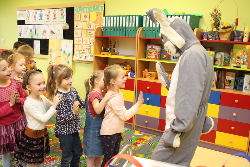 Zwieńczeniem spektaklu było przybycie długo wyczekiwanego gościa – zająca wielkanocnego, który wręczył dzieciom prezenty.
