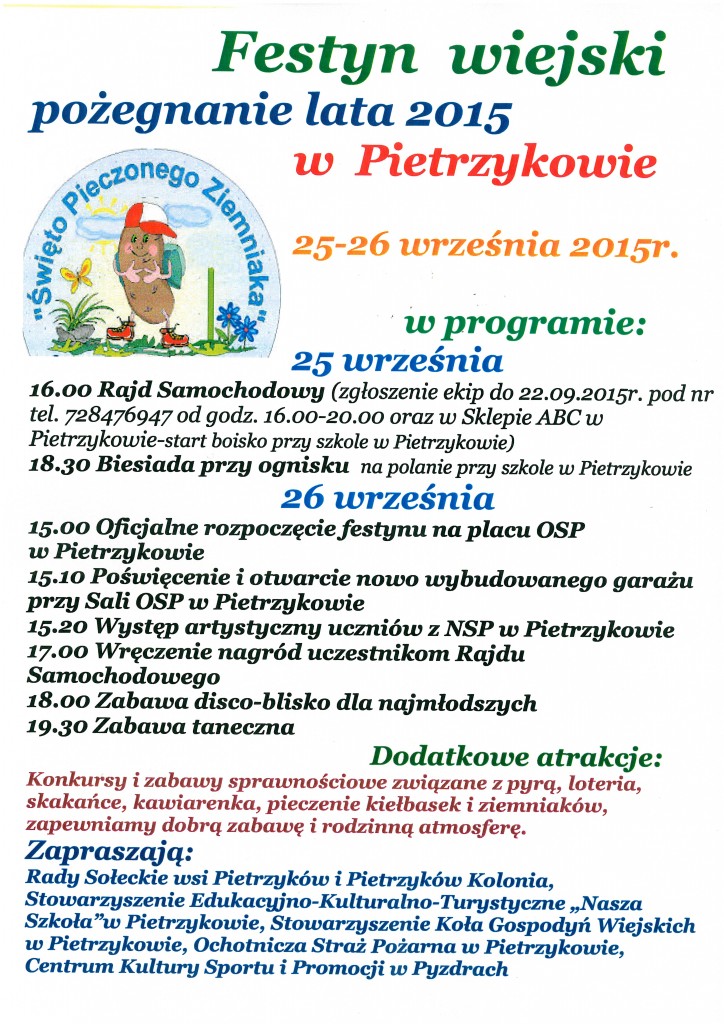 Rady Sołeckie wsi Pietrzyków i Pietrzyków Kolonia wraz z współorganizatorami serdecznie zapraszają na dwudniowy Festyn Wiejski w Pietrzykowie na "Pożegnanie lata 2015". Impreza rozpocznie się w piątek, 25 września o godz. 16.00. W trakcie dwudniowego festynu przygotowano wiele atrakcji dla dzieci i dorosłych, oprócz bogatego programu artystycznego, będzie się rajd samochodowy i otwarcie nowo wybudowanego garażu. Szczegóły na plakacie.