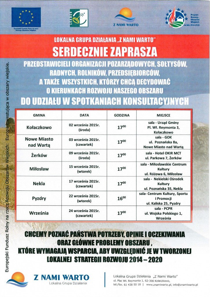 Lokalna Grupa Działania "Z Nami Warto" serdecznie zaprasza przedstawicieli organizacji pozarządowych, sołtysów, radnych, rolników, przedsiębiorców, a także wszystkich, którzy chcą decydować o kierunkach rozwoju naszego obszaru do udziału w spotkaniach konsultacyjnych. Spotkanie w gminie Pyzdry odbędzie się 22 września 2015r. o godz. 16:00 w sali CKSiP, ul. Kaliska 25.