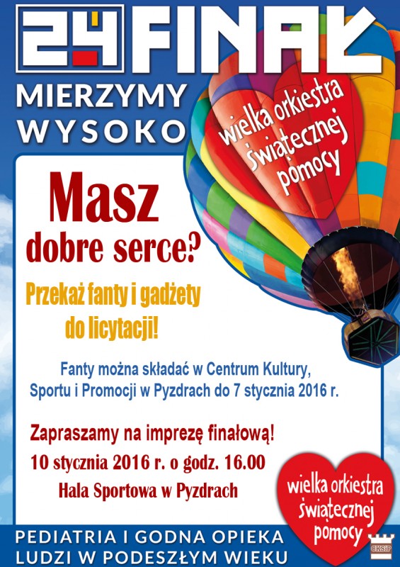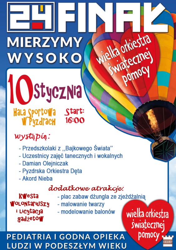 Już w najbliższą niedzielę 10 stycznia odbędzie się 24. Finał Wielkiej Orkiestry Świątecznej Pomocy. Jak co roku w godzinach przedpołudniowych wolontariusze będą kwestować na terenie miasta, natomiast po południu w hali sportowej odbędzie się impreza, podczas której będą prowadzone liczne licytacje.