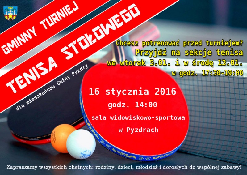 Serdecznie zapraszamy mieszkańców na Gminny Turniej Tenisa Stołowego, który odbędzie się już jutro - 16 stycznia o godz. 14:00 w sali widowiskowo - sportowej w Pyzdrach.