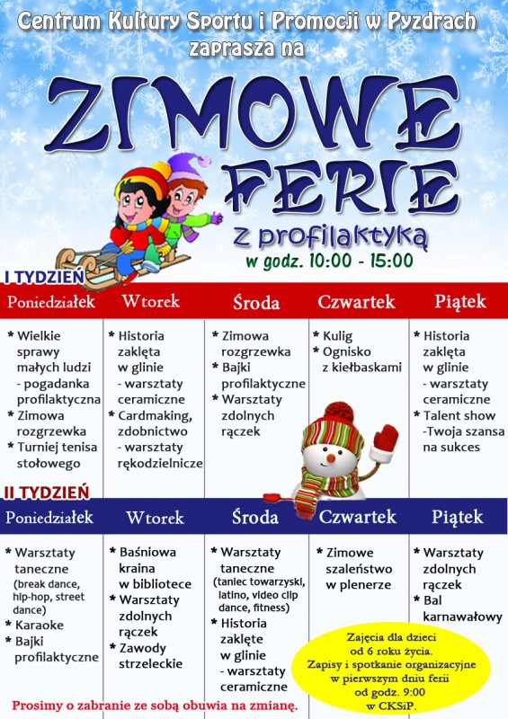 Centrum Kultury Sportu i Promocji w Pyzdrach zaprasza dzieci i młodzież na zimowe ferie z profilaktyką. Celem organizacji zajęć jest promowanie, zdrowego stylu życia oraz wskazanie alternatywnych form spędzania wolnego czasu. Chcemy zachęcić dzieci i młodzież do aktywnego wypoczynku.