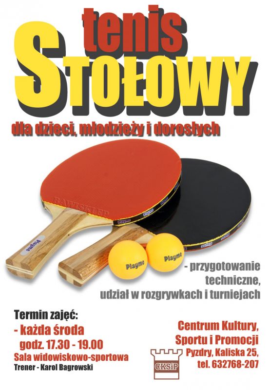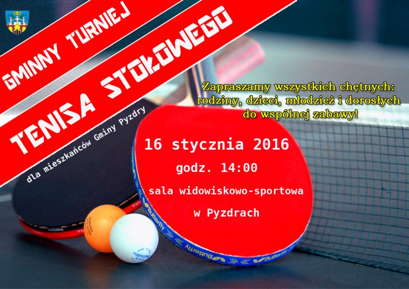 Serdecznie zapraszamy mieszkańców na Gminny Turniej Tenisa Stołowego, który odbędzie się 16 stycznia (tj. sobota) o godz. 14:00 w sali widowiskowo - sportowej w Pyzdrach.