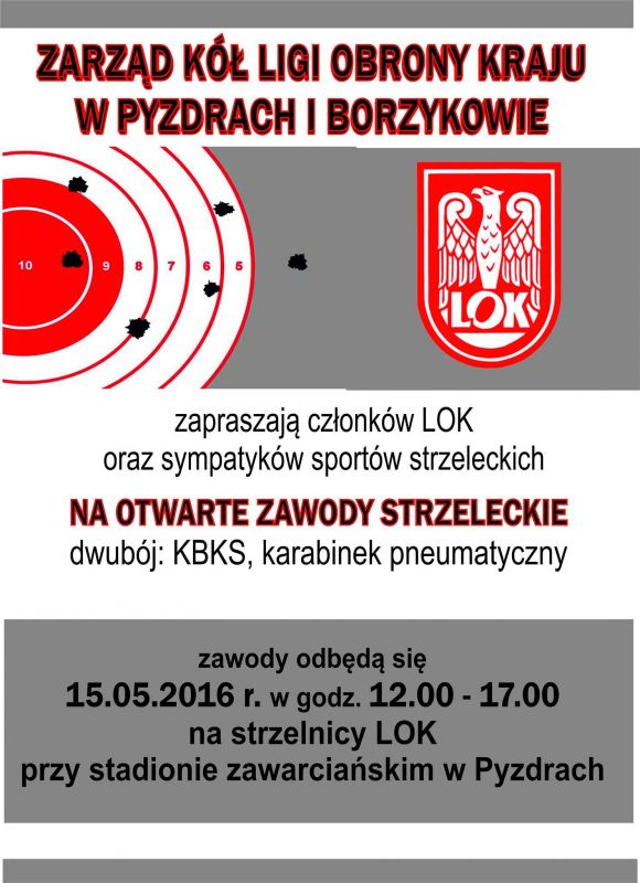 Zarządy kół Ligi Obrony Kraju w Pyzdrach i Borzykowie oraz Klub Strzelecko-Rekreacyjny „Ogończyk” Nekla zapraszają młodzież do uczestnictwa w I Młodzieżowych Zawodach Integracyjnych w Strzelectwie Sportowym.