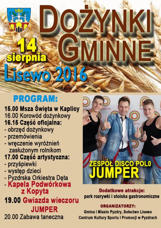 Dożynki rozpoczną się mszą świętą, odprawioną w miejscowej kaplicy. Po niej barwny korowód ruszy na plac przy szkole, gdzie odbywać się będzie dalsza część uroczystości. W programie przewidzieliśmy obrzęd dożynkowy, przyśpiewki w wykonaniu Lisewianek i występ dzieci. Zagra Pyzdrska Orkiestra Dęta, rozbawi Kapela Podwórkowa z Kopyta. Gwiazdą wieczoru będzie zespoł disco polo - Jumper. Po nim rozpocznie się zabawa taneczna