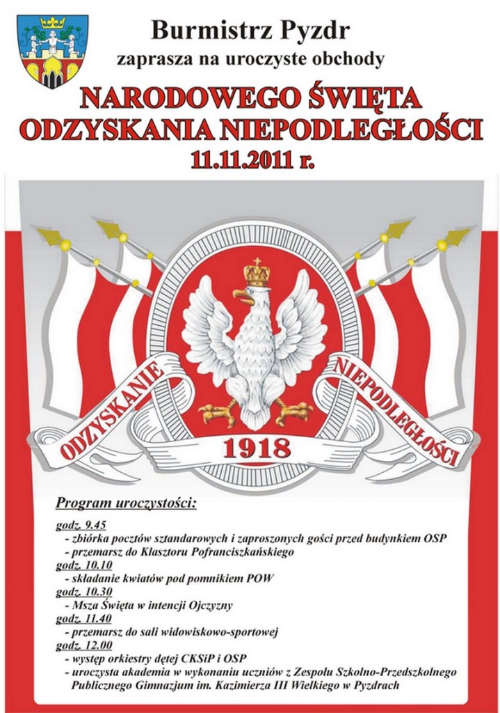 Serdecznie zapraszamy mieszkańców pyzdrskiej gminy do wzięcia udziału w obchodach Święta Odzyskania Niepodległości. Szczegóły na załączonym plakacie.