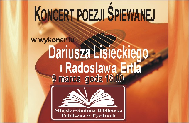 Serdecznie zapraszamy na koncert poezji śpiewanej w wykonaniu Dariusza Lisieckiego i Radosława Ertla, który odbędzie się 9 marca o godz. 18.00 w siedzibie biblioteki.