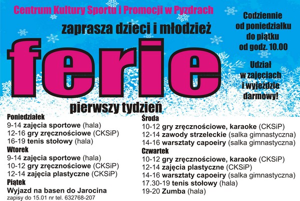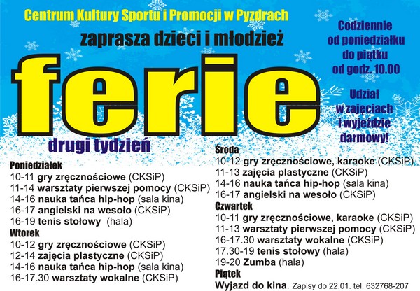 Serdecznie zapraszamy dzieci i młodzież z pyzdrskiej gminy do wzięcia udziału w zaproponowanych przez CKSiP zajęciach.