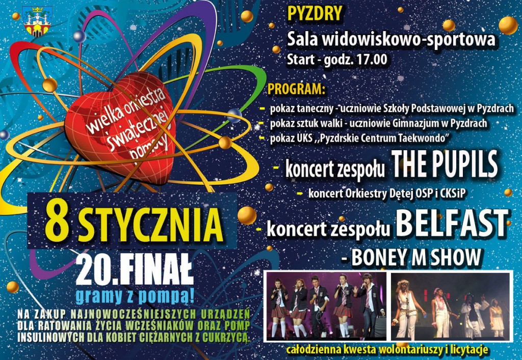 Serdecznie zapraszamy Państwa do wzięcia udziału w XX Finale Wielkiej Orkiestry Świątecznej Pomocy. W tym roku gramy z pompą! Zdrowa mama, zdrowy wcześniak, zdrowe dziecko, czyli na zakup najnowocześniejszych urządzeń dla ratowania życia wcześniaków oraz pomp insulinowych dla kobiet ciężarnych z cukrzycą.