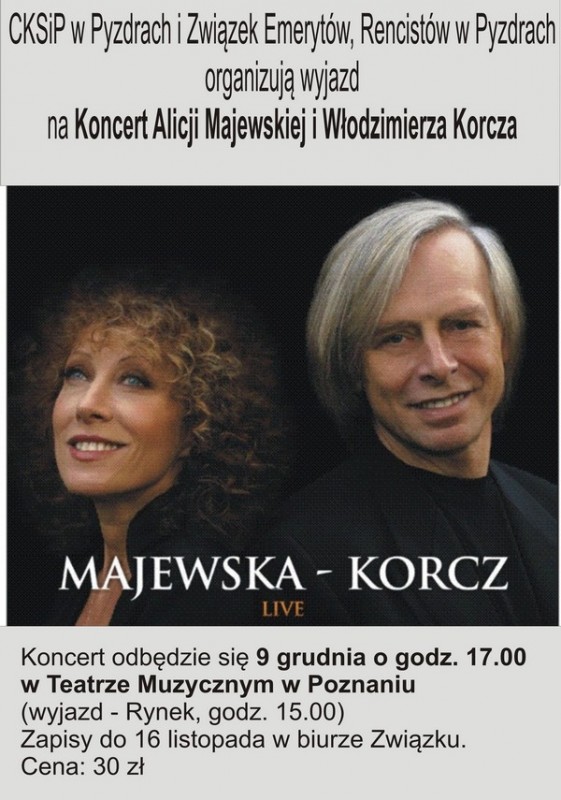 CKSiP w Pyzdrach oraz Związek Emerytów i Rencistów organizują wyjazd do Teatru Muzycznego w Poznaniu na koncert Alicji Majewskiej i Włodzimierza Korcza. Szczegóły w załączeniu.