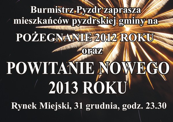 Serdecznie zapraszamy mieszkańców pyzdrskiej gminy do pożegnania starego i powitania Nowego Roku . Spotykamy się 31 grudnia na Rynku Miejskim o godz. 23.30.