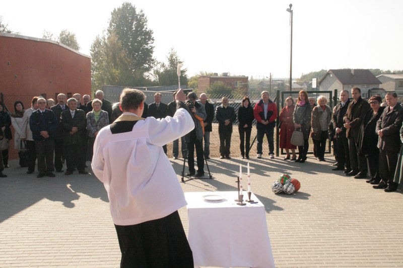 Obiekt został poświęcony przez ks. kanonika Ryszarda Kopczyńskiego, proboszcza parafii. Symbolicznego przecięcia wstęgi dokonali: Tadeusz Tomaszewski Poseł na Sejm RP, Mariusz Kubiak z Departamentu Sportu i Turystyki Urzędu Marszałkowskiego w Poznaniu, Dionizy Jaśniewicz, starosta powiatu wrzesińskiego, Krzysztof Strużyński, burmistrz Pyzdr, Elżbieta Kłossowska, przewodnicząca rady miejskiej w Pyzdrach oraz przedstawiciel młodzieży - Filip Mosiński.