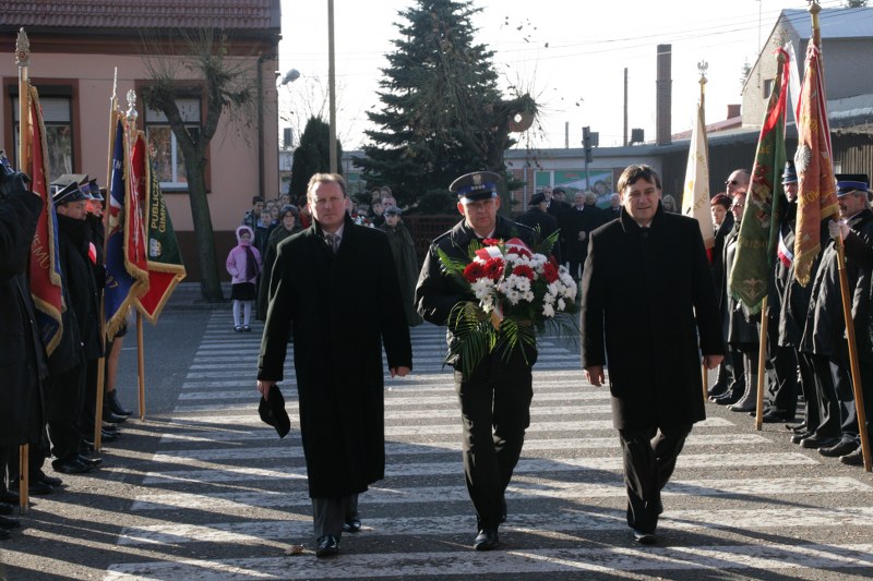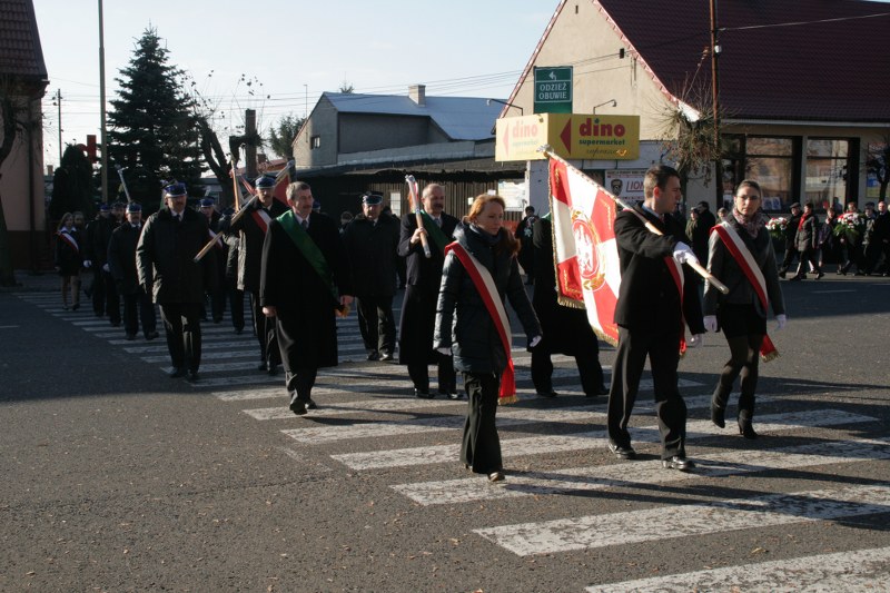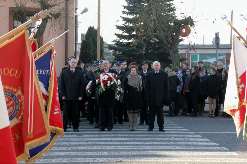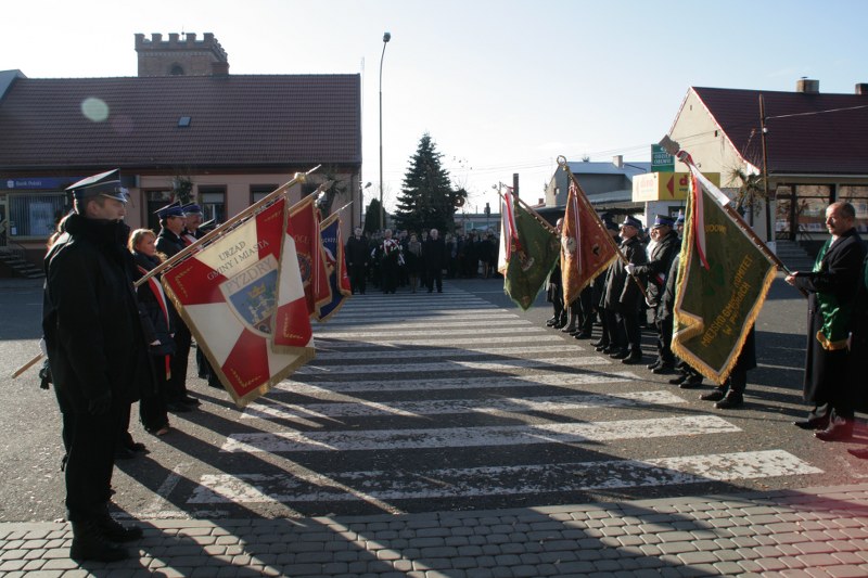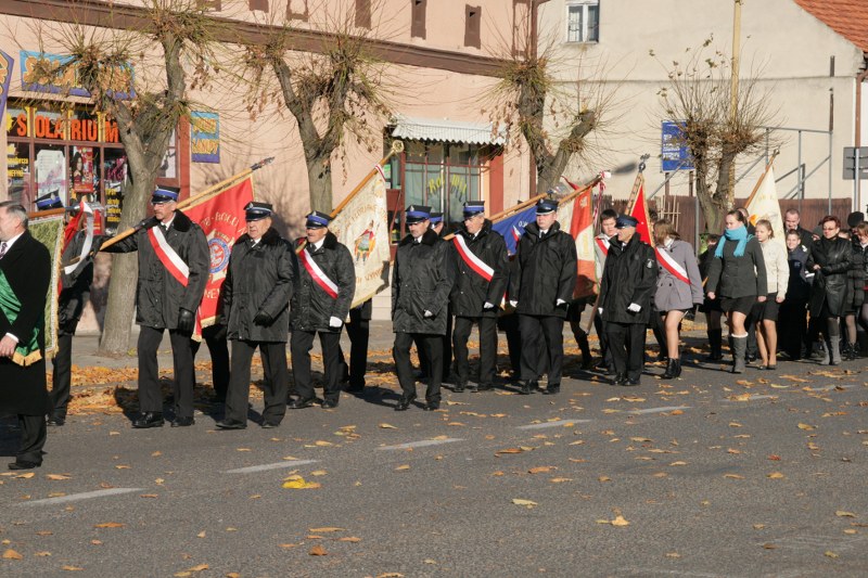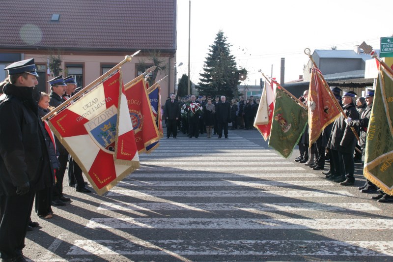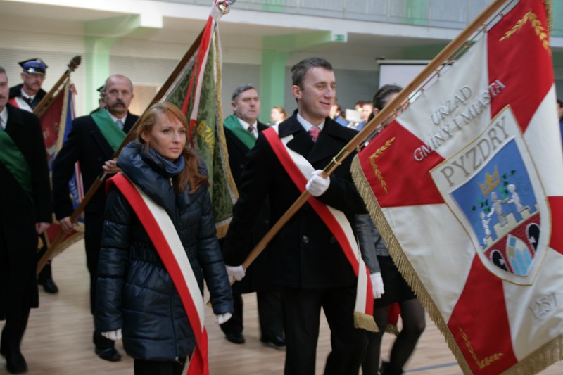 Tradycyjnie już delegacje związkowe i zaproszeni goście spotkali się rano przed remizą strażacką, by po chwili przemaszerować na pyzdrski Rynek. Tam składali kwiaty pod pomnikiem Polskiej Organizacji Wojskowej. Mszę świętą w intencji Ojczyzny odprawił ks. kanonik Ryszard Kopczyński, proboszcz parafii. Przywołując podniosłe myśli poetów i pisarzy mówił czym dla nas powinna być Ojczyzna. Zachęcał do refleksji nad darem wolności.