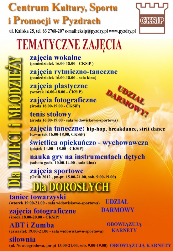 Przypominamy, iż od miesiąca w Centrum Kultury Sportu i Promocji odbywają się tematyczne zajęcia skierowane dla dzieci, młodzieży i dorosłych. Zachęcamy zatem do korzystania z wprowadzonej oferty.