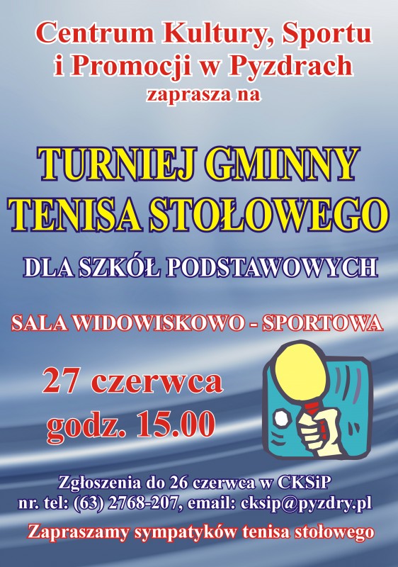 27 czerwca w sali widowiskowo-sportowej odbędzie się Gminny Turniej Tenisa Stołowego. Mogą wziąć w nim udział uczniowie szkół podstawowych. Szczegóły w załączeniu.