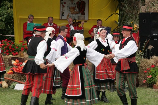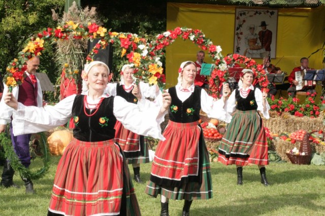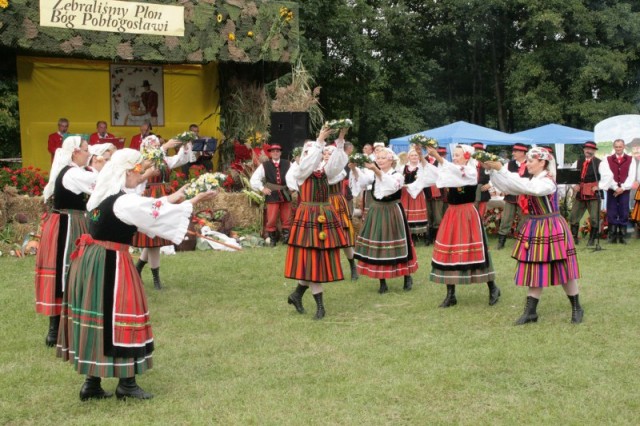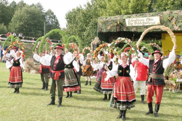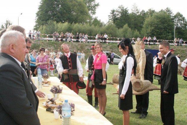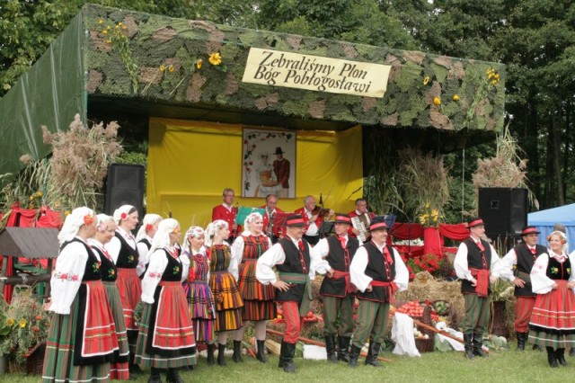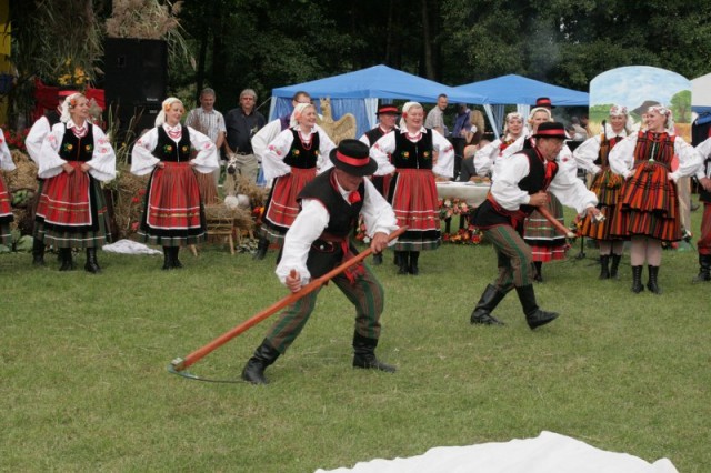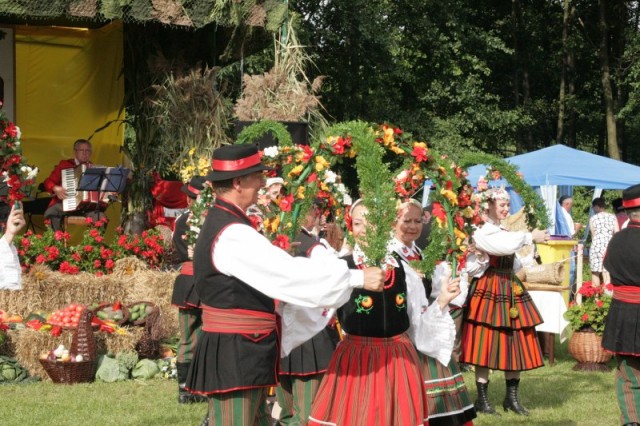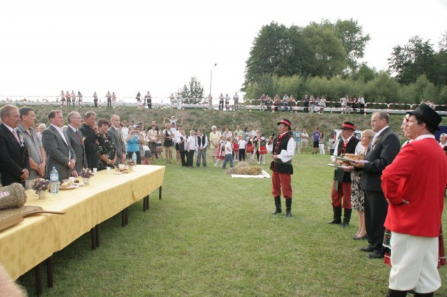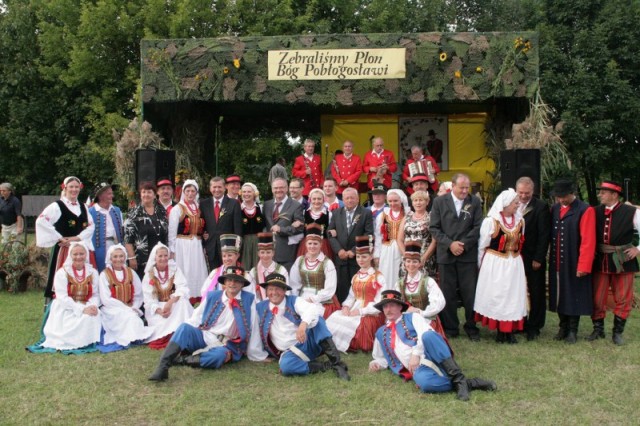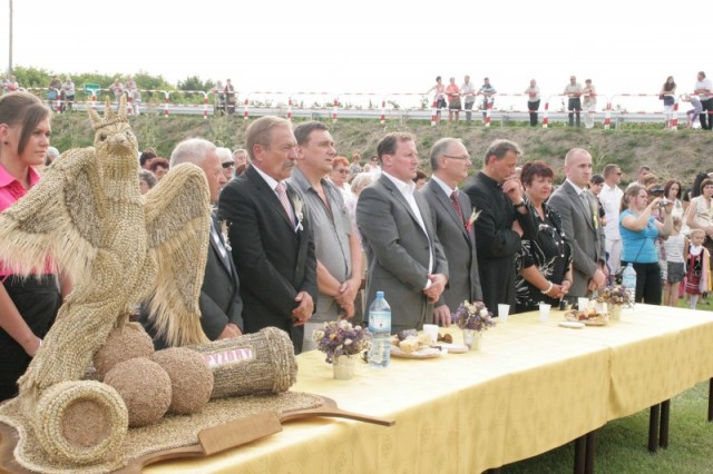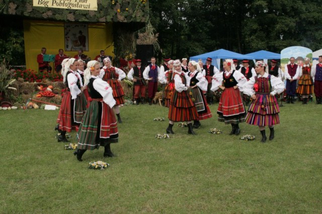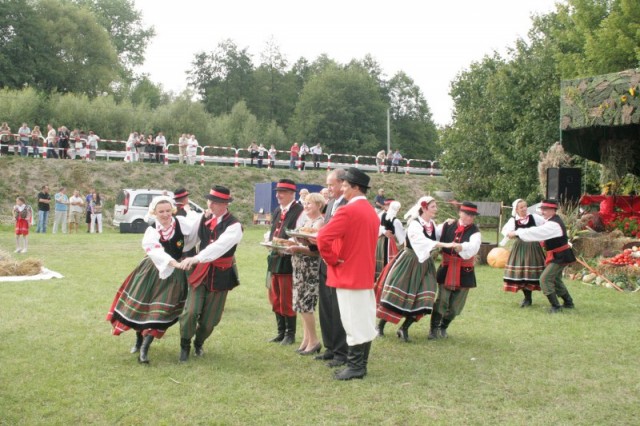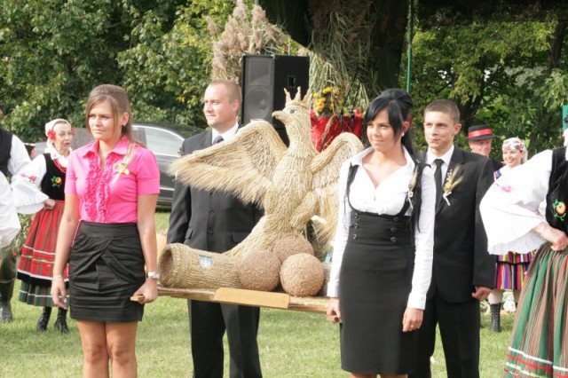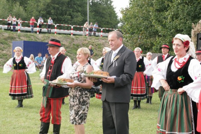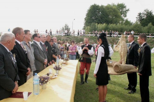 Następnie Zespół Tańca Ludowego Staropolanie Wielkopolska wykonał tradycyjny obrzęd dożynkowy, którym zachwycił zgromadzoną publiczność. Starostowie dożynek Donata Ciesielska i Józef Banaszak przekazali na ręce gospodarzy – Burmistrza Pyzdr Krzysztofa Strużyńskiego i Sołtysa Sołectwa Dłusk Romana Witczaka – miód i bochen chleba.