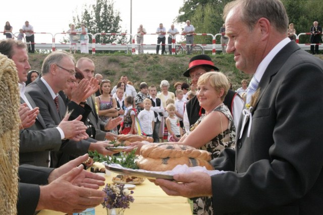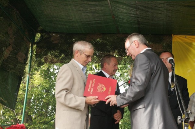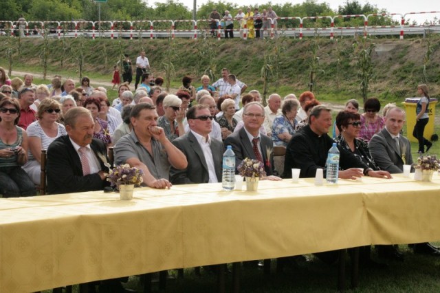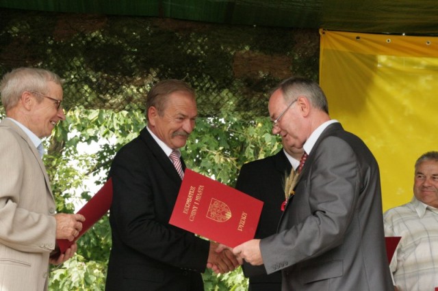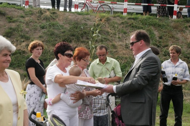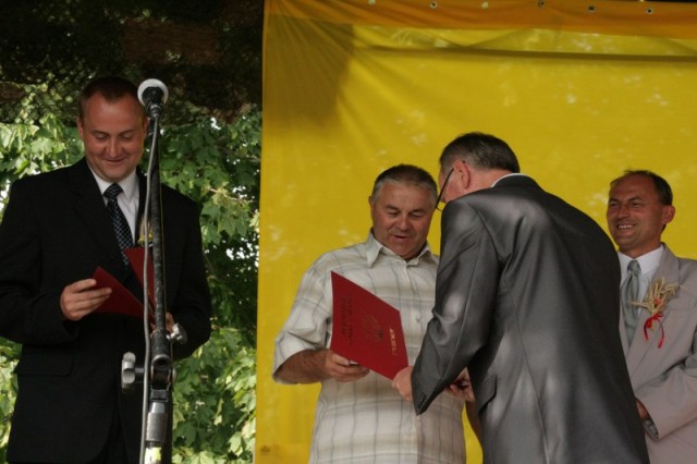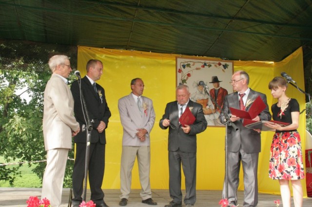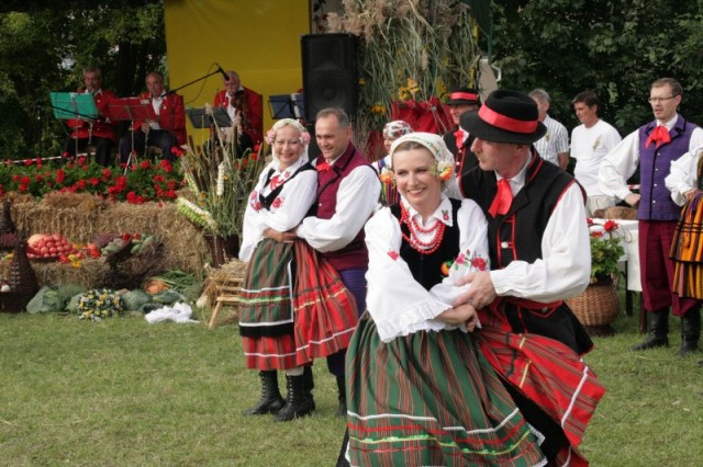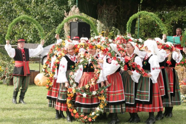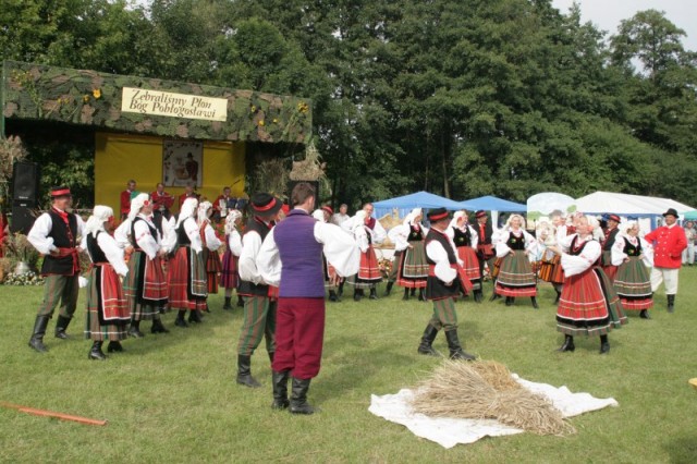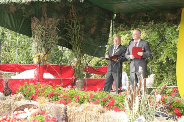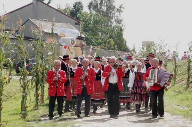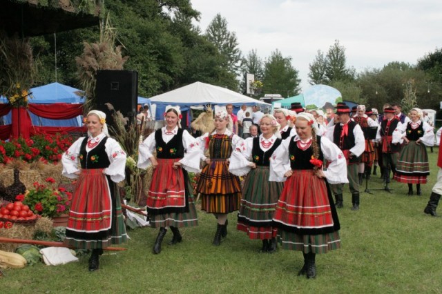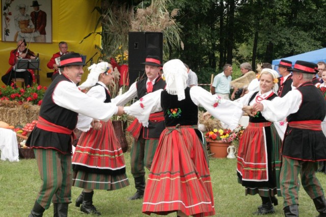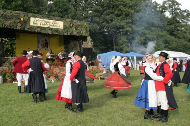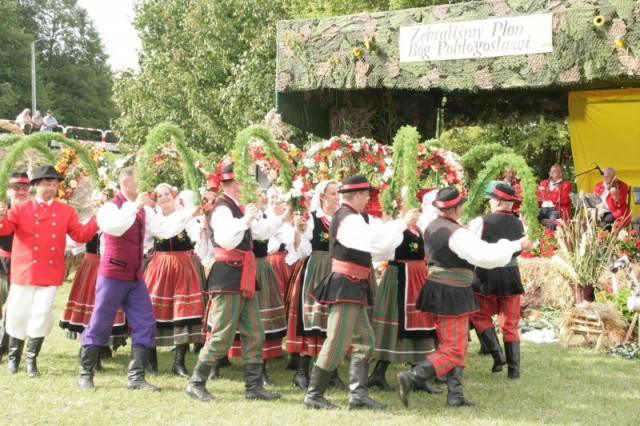 Następnie Zespół Tańca Ludowego Staropolanie Wielkopolska wykonał tradycyjny obrzęd dożynkowy, którym zachwycił zgromadzoną publiczność. Starostowie dożynek Donata Ciesielska i Józef Banaszak przekazali na ręce gospodarzy – Burmistrza Pyzdr Krzysztofa Strużyńskiego i Sołtysa Sołectwa Dłusk Romana Witczaka – miód i bochen chleba.