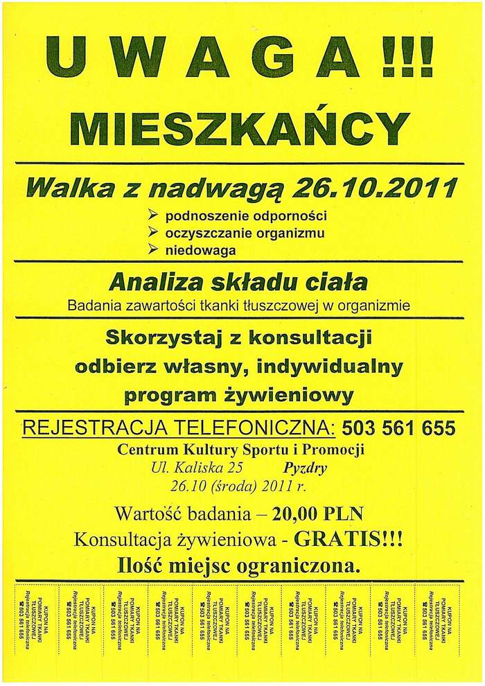 Serdecznie zachęcamy mieszkańców do skorzystania z badań, które zostaną przeprowadzone w Centrum Kultury Sportu i Promocji w Pyzdrach. Badania, zaplanowane na 26 października dotyczą pomiaru zawartości tkanki tłuszczowej w organizmie, a 3 listopada - komputerowego badania wzroku. Szczegóły na załączonych plakatach.