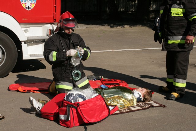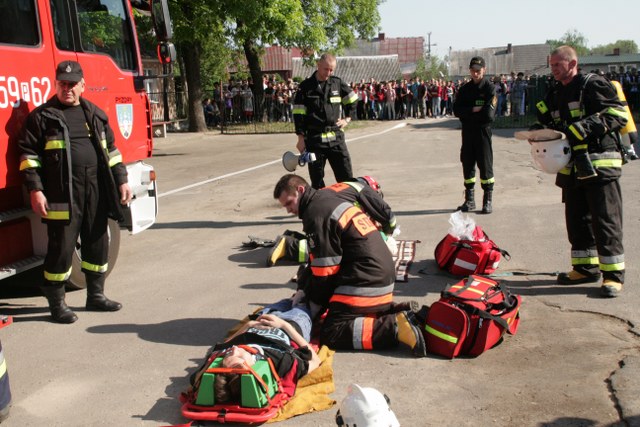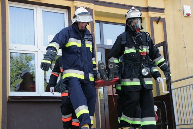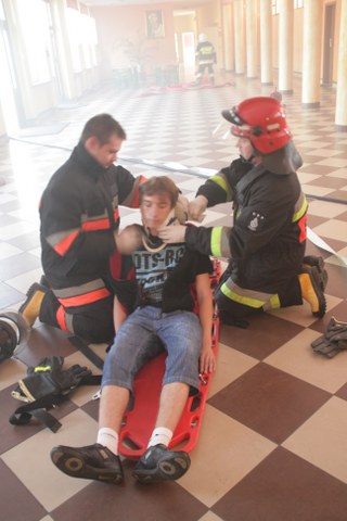 W budynku szybko zaczął rozprzestrzeniać się dym. Szybko ewakuowano uczniów, nauczycieli oraz pracowników obsługi. Wszyscy sprawnie przemieścili się w bezpieczne miejsce na boisku. W czasie ewakuacji dwóch uczniów doznało urazu, uniemożliwiającego samodzielne wydostanie się z budynku. Pozostali w strefie zagrożenia. Po pięciu minutach przybyły dwie jednostki strażackie. Druhowie przystąpili do działań ratowniczo-gaśniczych. Wyposażeni w aparaty powietrzne odnaleźli uwięzionych uczniów i udzielili im pierwszej pomocy.