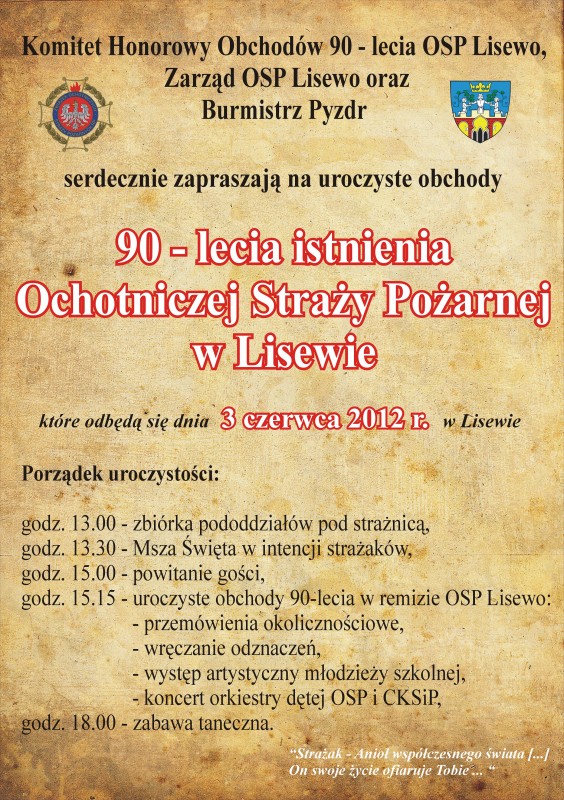 Jednostka Ochotniczej Straży Pożarnej w Lisewie w tym roku obchodzi 90-lecie istnienia. Jubileuszowe obchody odbędą się 3 czerwca w Lisewie.