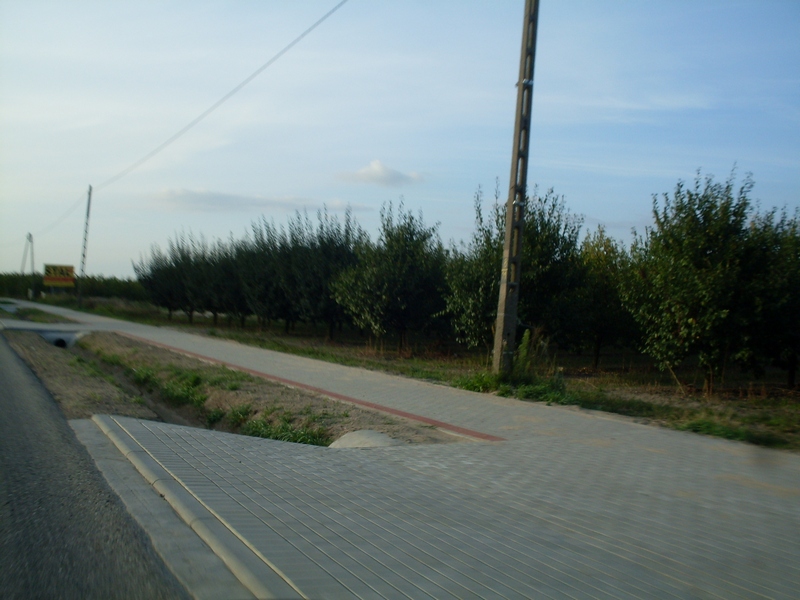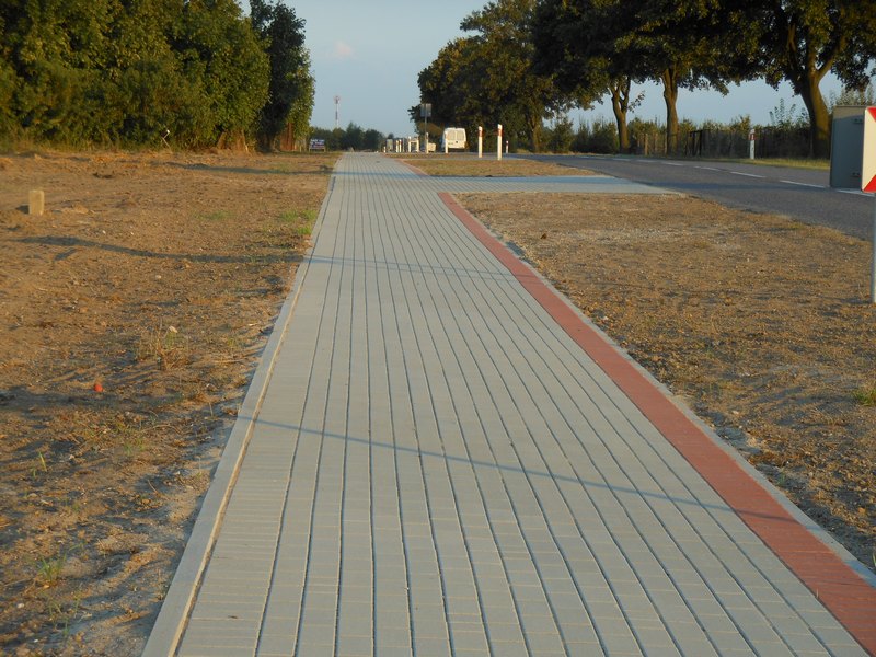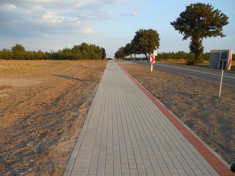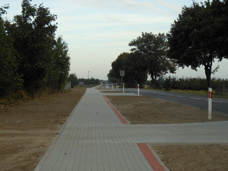 Ścieżka rowerowa powstała po lewej stronie drogi na odcinku Borzykowo-Pyzdry od km 16+095 do 18+543 – 2,448 km, czyli od granicy z Borzykowem do wysokości przystanku autobusowego w Pyzdrach. Równolegle do osi jezdni i oddzielona od niej poboczem. Budowa polegała na wykonaniu ścieżki o szerokości 2 m o nawierzchni z kostki betonowej na podsypce piaskowej ze zjazdami o podbudowie grubości 15 cm. Pod zjazdami zostały ułożone przepusty z rur PVC.