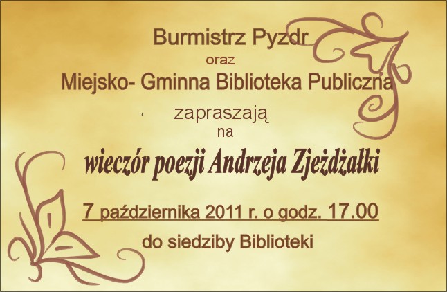 Serdecznie zapraszamy na wieczór poezji pyzdrzanina - Andrzeja Zjeżdzałki. Szczegóły na załączonym plakacie.
