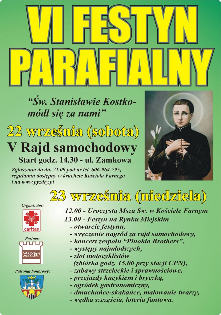 Serdecznie zapraszamy na VI Festyn Parafialny 22 i 23 września 2012 roku. Szczegóły na załączonym plakacie.
