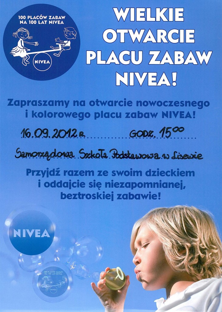 Samorządowa Szkoła Podstawowa w Lisewie zaprasza na Wielkie otwarcie placu zabaw ufundowanego przez NIVEA Polska Sp. z o.o.. Szczegóły na załączonym plakacie.