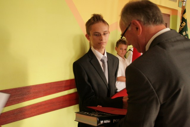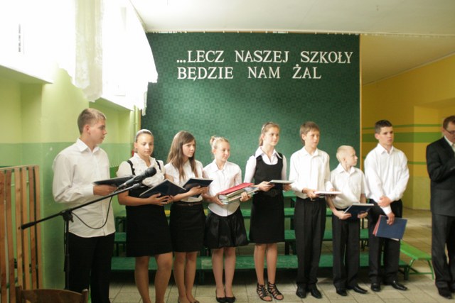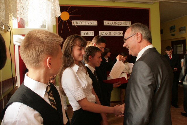 Wśród tegorocznych absolwentów pyzdrskiej placówki są uczniowie, którzy zdobywali same piątki, ale też tacy, którym nie wszystko się udało, ale pracowali z całych sił i nauczyciele to docenili. Dyrektor Roman Dreżewski z łezką w oku wszystkim życzył powodzenia na dalszych etapach edukacji, aby nauczyli się szanować czas i mądrze nim dysponowali, bo od tej pory sami będą decydować ile umiejętności zdobędą. Podziękował także organom prowadzącym szkołę: Burmistrzowi i Radzie Miejskiej, że wspierają ją finansowo, nauczycielom i pedagogom za trud włożony w przekazywanie wiedzy oraz rodzicom, którzy niezmiennie trwali przy swoich dzieciach, troszcząc się o nich i dbając, by wyrośli na mądrych ludzi. Najlepszymi wynikami w nauce wśród uczniów szkoły podstawowej wyróżnili się: Konrad Kubacki, Julita Wawrzyniak, Roma Zdunek, Olga Radziejewska, Agata Grądecka, Jakub Radziejewski, Dawid Tabert i Wojciech Witkowski. Wśród gimnazjalistów najlepsze wyniki osiągnęli: Łukasz Styczyński, Marika Potarzycka, Marta Winter, Sandra Łyskawińska, Julia Skitek, Rafał Gonerka, Piotr Kłossowski i Dawid Lajtlich. Nagrodę Burmistrza Pyzdr Krzysztofa Strużyńskiego otrzymali: Olga Radziejewska i Łukasz Styczyński.