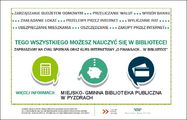 Realizatorem projektu ,,O finansach w bibliotece'' jest Fundacja Rozwoju Społeczeństwa Informacyjnego we współudziale z Narodowym Bankiem Polskim i wsparciem bezpośrednim Wojewódzkiej Biblioteki Publicznej i Centrum Animacji Kultury w Poznaniu. Pyzdrska Biblioteka jako jedna z jedenastu placówek z terenu Wielkopolski, a jedyna z powiatu wrzesińskiego będzie realizowała projekt .