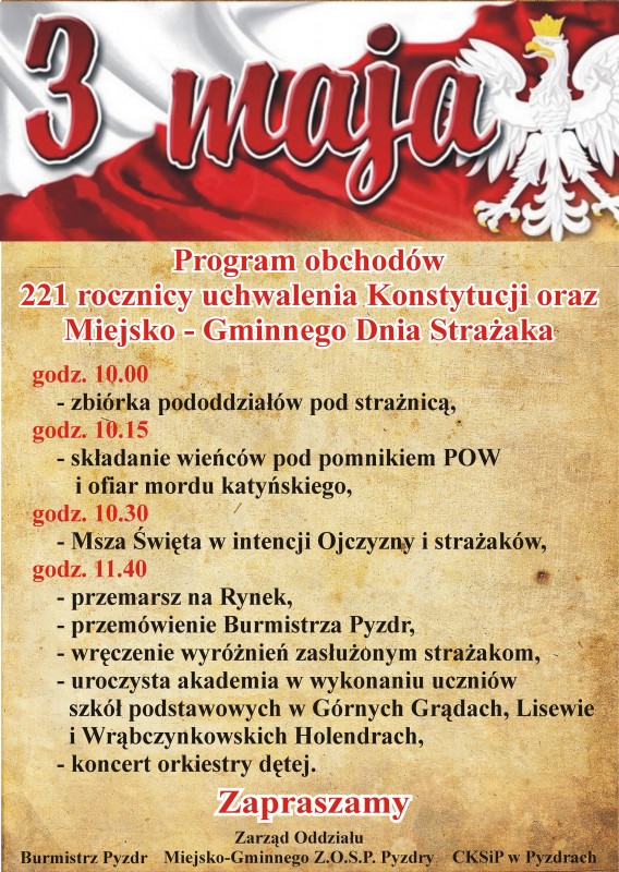 Zapraszamy mieszkańców pyzdrskiej gminy do wzięcia udziału w Obchodach Uchwalenia Konstytucji 3-go Maja i Miejsko-Gminnego Dnia Strażaka. Szczegóły w załączonym plakacie.