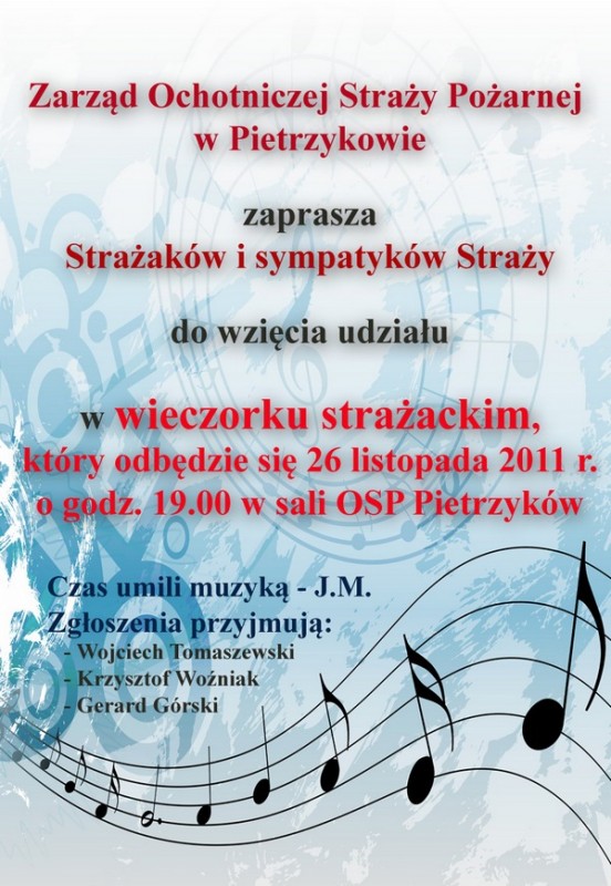 Zarząd Ochotniczej Straży Pożarnej zaprasza strażaków i sympatyków tej formacji na wieczór strażacki. Impreza odbędzie się 26 listopada w sali OSP w Pietrzykowie. Szczegóły na załączonym plakacie.