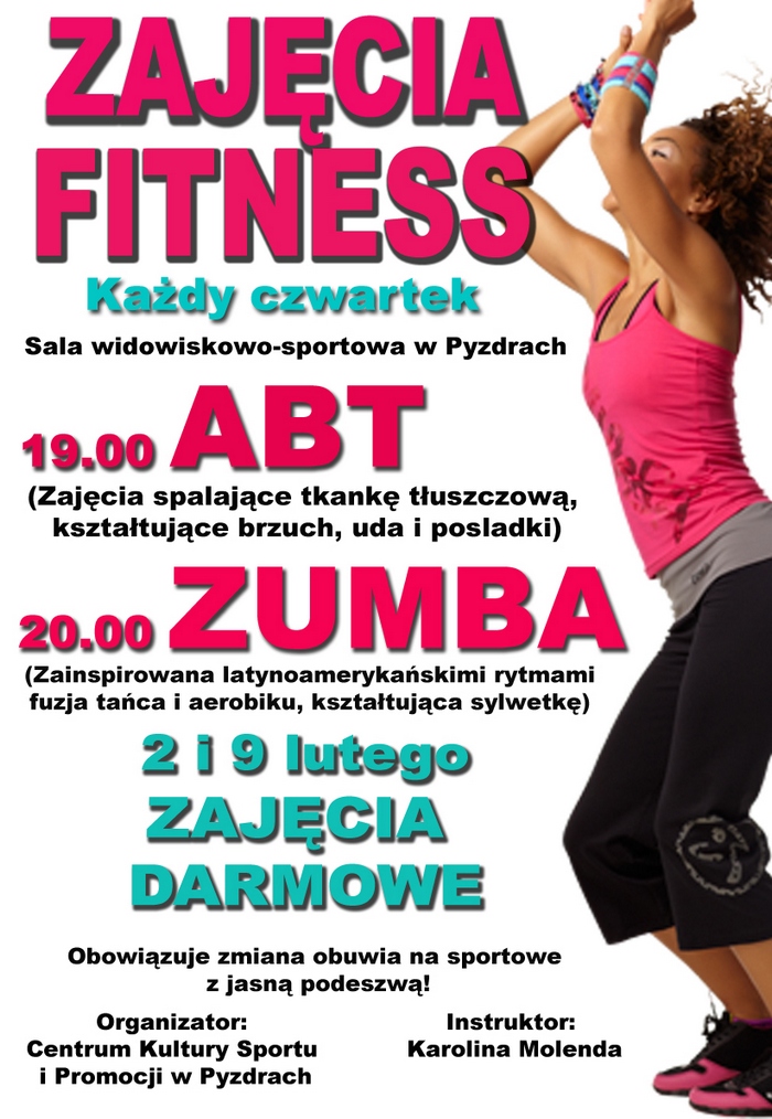 Uwaga dziewczyny i panie!!! CKSiP w Pyzdrach daje Wam propozycje!! Dwa najbliższe czwartki - zajęcia fitness (ABT i ZUMBA) - darmowe!!