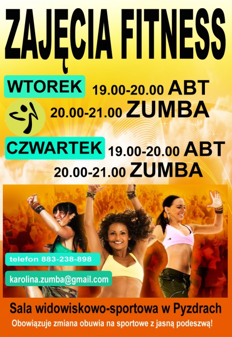 Przypominamy, iż po wakacyjnej przerwie wznowione zostały zajęcia fitnessu – Zumba i ABT. Zajęcia odbywają się w czwartki w sali widowiskowo-sportowej. Plakat informacyjny w załączeniu.