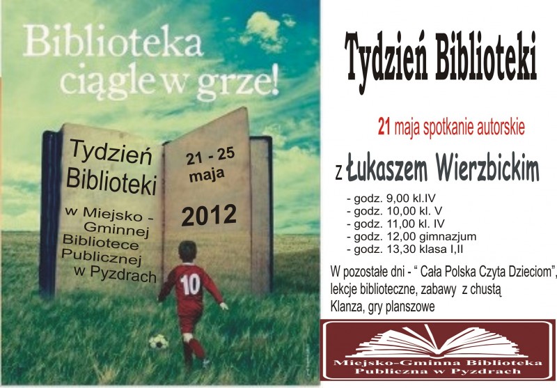 Hasło tygodnia Biblioteki 2012 pozwala w różnych formach pokazać pozytywne zmiany, które zachodzą w naszej placówce. Jest też okazją do promowania literatury pięknej i popularnonaukowej. Większość inicjatyw skierowana jest do najmłodszych. Chcemy zaszczepić w najmłodszych pasję czytania poprzez różne ciekawe pomysły – poprzez spotkania autorskie, głośne czytania „Cała Polska Czyta Dzieciom”, zabawy i pląsy.